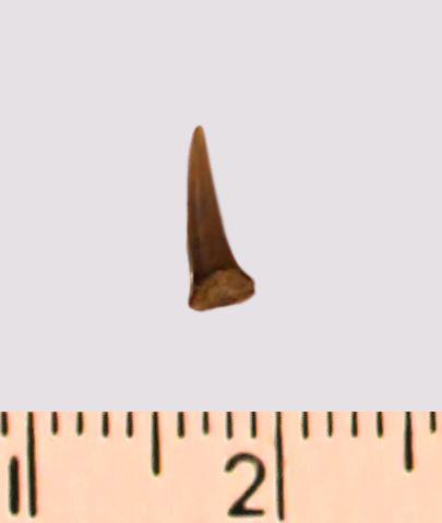 Зуб (фрагмент). Акула. Eostriatolamia gracilis (Davis, 1890). Классификация: Хордовые Chordata, Позвоночные Vertebrata, Хрящевые рыбы Chondrichthyes, Пластиножаберные Elasmobranchii