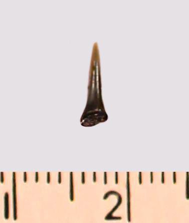 Зуб (фрагмент). Акула. Eostriatolamia gracilis (Davis, 1890). Классификация: Хордовые Chordata, Позвоночные Vertebrata, Хрящевые рыбы Chondrichthyes, Пластиножаберные Elasmobranchii