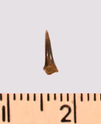 Зуб (фрагмент). Акула. Eostriatolamia gracilis (Davis, 1890). Классификация: Хордовые Chordata, Позвоночные Vertebrata, Хрящевые рыбы Chondrichthyes, Пластиножаберные Elasmobranchii
