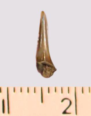 Зуб (фрагмент). Акула. Eostriatolamia gracilis (Davis, 1890). Классификация: Хордовые Chordata, Позвоночные Vertebrata, Хрящевые рыбы Chondrichthyes, Пластиножаберные Elasmobranchii