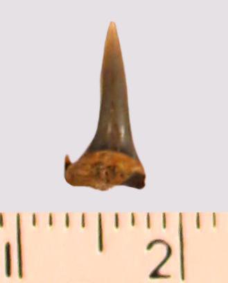 Зуб (фрагмент). Акула. Eostriatolamia gracilis (Davis, 1890). Классификация: Хордовые Chordata, Позвоночные Vertebrata, Хрящевые рыбы Chondrichthyes, Пластиножаберные Elasmobranchii