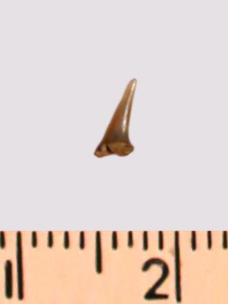 Зуб (фрагмент). Акула. Eostriatolamia gracilis (Davis, 1890). Классификация: Хордовые Chordata, Позвоночные Vertebrata, Хрящевые рыбы Chondrichthyes, Пластиножаберные Elasmobranchii