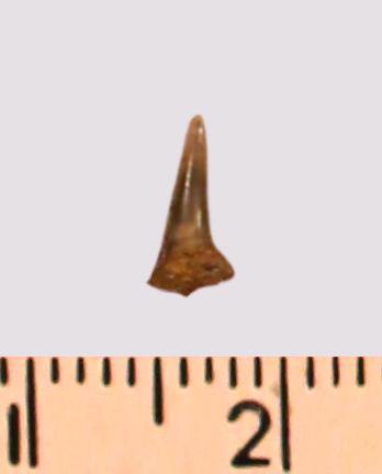 Зуб (фрагмент). Акула. Eostriatolamia gracilis (Davis, 1890). Классификация: Хордовые Chordata, Позвоночные Vertebrata, Хрящевые рыбы Chondrichthyes, Пластиножаберные Elasmobranchii