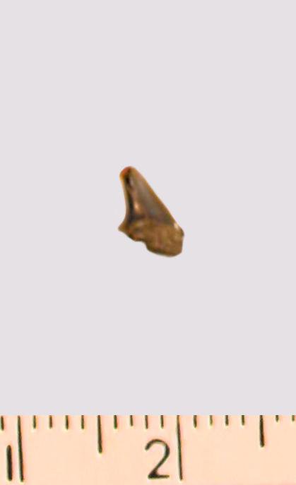 Зуб (фрагмент). Акула. Odontaspis macrorhiza (Cope) Leriche, 1902. Классификация: Хордовые Chordata, Позвоночные Vertebrata, Хрящевые рыбы Chondrichthyes, Пластиножаберные Elasmobranchii