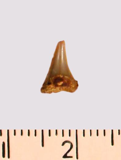 Зуб (фрагмент). Акула. Odontaspis macrorhiza (Cope) Leriche, 1902. Классификация: Хордовые Chordata, Позвоночные Vertebrata, Хрящевые рыбы Chondrichthyes, Пластиножаберные Elasmobranchii
