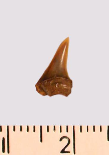 Зуб (фрагмент). Акула. Odontaspis macrorhiza (Cope) Leriche, 1902. Классификация: Хордовые Chordata, Позвоночные Vertebrata, Хрящевые рыбы Chondrichthyes, Пластиножаберные Elasmobranchii