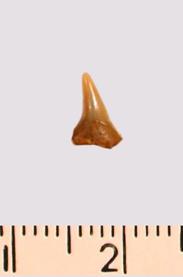Зуб (фрагмент). Акула. Odontaspis macrorhiza (Cope) Leriche, 1902. Классификация: Хордовые Chordata, Позвоночные Vertebrata, Хрящевые рыбы Chondrichthyes, Пластиножаберные Elasmobranchii