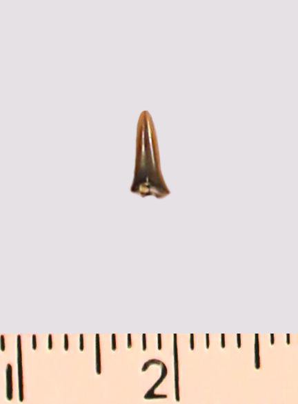 Зуб (фрагмент). Акула. Eostriatolamia gracilis (Davis, 1890). Классификация: Хордовые Chordata, Позвоночные Vertebrata, Хрящевые рыбы Chondrichthyes, Пластиножаберные Elasmobranchii