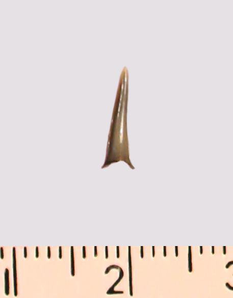 Зуб (фрагмент). Акула. Eostriatolamia gracilis (Davis, 1890). Классификация: Хордовые Chordata, Позвоночные Vertebrata, Хрящевые рыбы Chondrichthyes, Пластиножаберные Elasmobranchii