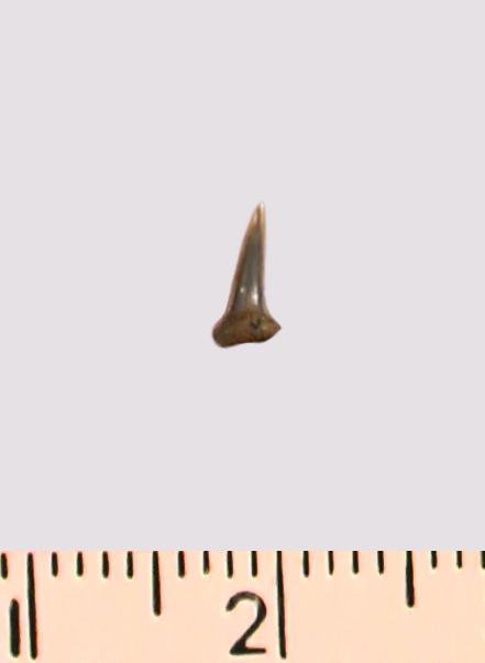 Зуб (фрагмент). Акула. Eostriatolamia gracilis (Davis, 1890). Классификация: Хордовые Chordata, Позвоночные Vertebrata, Хрящевые рыбы Chondrichthyes, Пластиножаберные Elasmobranchii