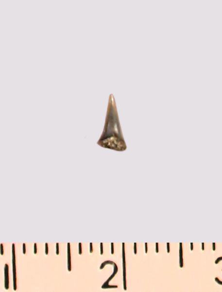Зуб (фрагмент). Акула. Eostriatolamia gracilis (Davis, 1890). Классификация: Хордовые Chordata, Позвоночные Vertebrata, Хрящевые рыбы Chondrichthyes, Пластиножаберные Elasmobranchii