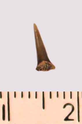 Зуб (фрагмент). Акула. Eostriatolamia gracilis (Davis, 1890). Классификация: Хордовые Chordata, Позвоночные Vertebrata, Хрящевые рыбы Chondrichthyes, Пластиножаберные Elasmobranchii