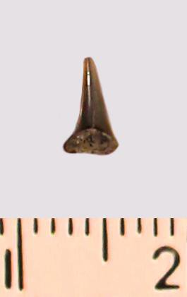 Зуб (фрагмент). Акула. Eostriatolamia gracilis (Davis, 1890). Классификация: Хордовые Chordata, Позвоночные Vertebrata, Хрящевые рыбы Chondrichthyes, Пластиножаберные Elasmobranchii