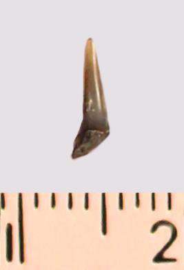 Зуб (фрагмент). Акула. Eostriatolamia gracilis (Davis, 1890). Классификация: Хордовые Chordata, Позвоночные Vertebrata, Хрящевые рыбы Chondrichthyes, Пластиножаберные Elasmobranchii