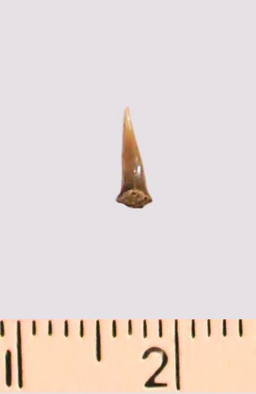 Зуб (фрагмент). Акула. Eostriatolamia gracilis (Davis, 1890). Классификация: Хордовые Chordata, Позвоночные Vertebrata, Хрящевые рыбы Chondrichthyes, Пластиножаберные Elasmobranchii