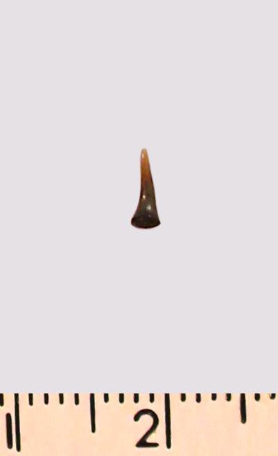 Зуб (фрагмент). Акула. Eostriatolamia gracilis (Davis, 1890). Классификация: Хордовые Chordata, Позвоночные Vertebrata, Хрящевые рыбы Chondrichthyes, Пластиножаберные Elasmobranchii