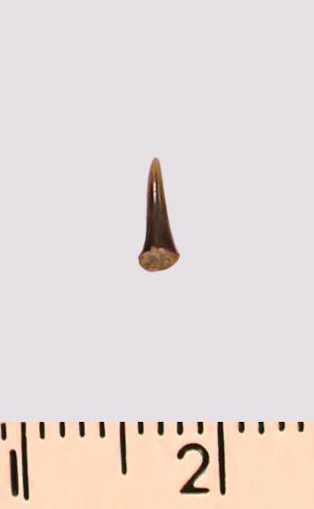 Зуб (фрагмент). Акула. Eostriatolamia gracilis (Davis, 1890). Классификация: Хордовые Chordata, Позвоночные Vertebrata, Хрящевые рыбы Chondrichthyes, Пластиножаберные Elasmobranchii