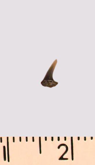 Зуб (фрагмент). Акула. Eostriatolamia gracilis (Davis, 1890). Классификация: Хордовые Chordata, Позвоночные Vertebrata, Хрящевые рыбы Chondrichthyes, Пластиножаберные Elasmobranchii