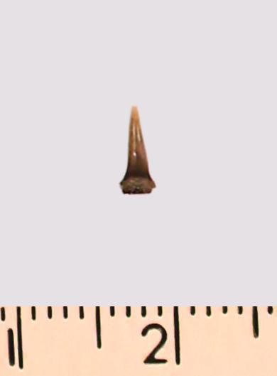 Зуб (фрагмент). Акула. Eostriatolamia gracilis (Davis, 1890). Классификация: Хордовые Chordata, Позвоночные Vertebrata, Хрящевые рыбы Chondrichthyes, Пластиножаберные Elasmobranchii