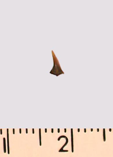 Зуб (фрагмент). Акула. Eostriatolamia gracilis (Davis, 1890). Классификация: Хордовые Chordata, Позвоночные Vertebrata, Хрящевые рыбы Chondrichthyes, Пластиножаберные Elasmobranchii