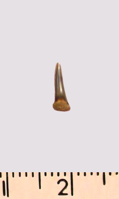 Зуб (фрагмент). Акула. Eostriatolamia gracilis (Davis, 1890). Классификация: Хордовые Chordata, Позвоночные Vertebrata, Хрящевые рыбы Chondrichthyes, Пластиножаберные Elasmobranchii