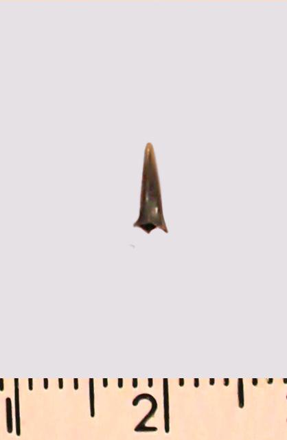 Зуб (фрагмент). Акула. Eostriatolamia gracilis (Davis, 1890). Классификация: Хордовые Chordata, Позвоночные Vertebrata, Хрящевые рыбы Chondrichthyes, Пластиножаберные Elasmobranchii