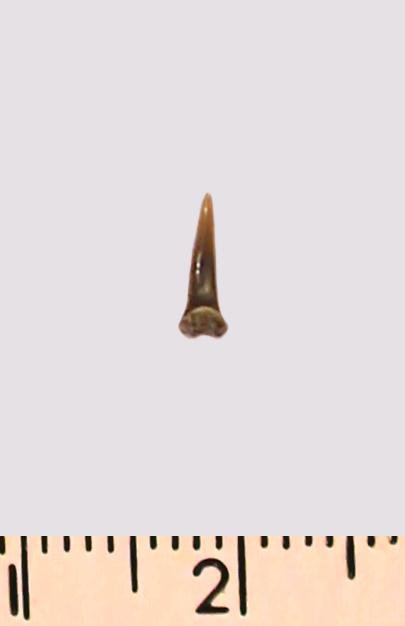 Зуб (фрагмент). Акула. Eostriatolamia gracilis (Davis, 1890). Классификация: Хордовые Chordata, Позвоночные Vertebrata, Хрящевые рыбы Chondrichthyes, Пластиножаберные Elasmobranchii