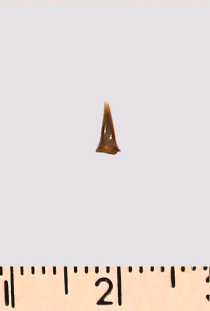 Зуб (фрагмент). Акула. Eostriatolamia gracilis (Davis, 1890). Классификация: Хордовые Chordata, Позвоночные Vertebrata, Хрящевые рыбы Chondrichthyes, Пластиножаберные Elasmobranchii