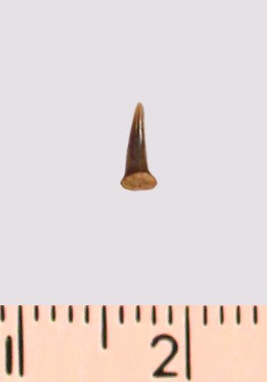 Зуб (фрагмент). Акула. Eostriatolamia gracilis (Davis, 1890). Классификация: Хордовые Chordata, Позвоночные Vertebrata, Хрящевые рыбы Chondrichthyes, Пластиножаберные Elasmobranchii