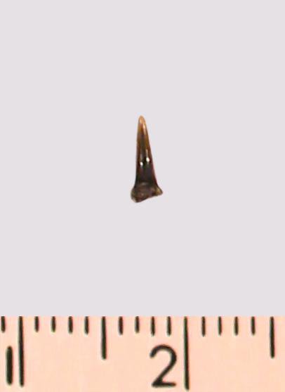 Зуб (фрагмент). Акула. Eostriatolamia gracilis (Davis, 1890). Классификация: Хордовые Chordata, Позвоночные Vertebrata, Хрящевые рыбы Chondrichthyes, Пластиножаберные Elasmobranchii