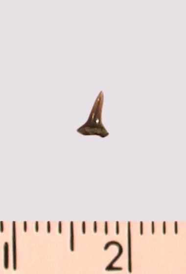 Зуб (фрагмент). Акула. Eostriatolamia gracilis (Davis, 1890). Классификация: Хордовые Chordata, Позвоночные Vertebrata, Хрящевые рыбы Chondrichthyes, Пластиножаберные Elasmobranchii