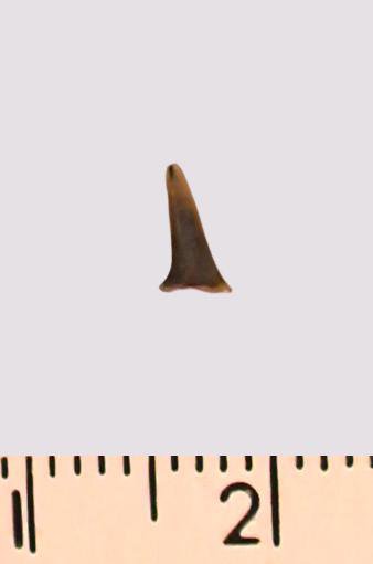 Зуб (фрагмент). Акула. Eostriatolamia gracilis (Davis, 1890). Классификация: Хордовые Chordata, Позвоночные Vertebrata, Хрящевые рыбы Chondrichthyes, Пластиножаберные Elasmobranchii
