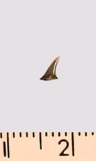 Зуб (фрагмент). Акула. Eostriatolamia gracilis (Davis, 1890). Классификация: Хордовые Chordata, Позвоночные Vertebrata, Хрящевые рыбы Chondrichthyes, Пластиножаберные Elasmobranchii