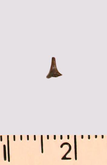 Зуб (фрагмент). Акула. Eostriatolamia gracilis (Davis, 1890). Классификация: Хордовые Chordata, Позвоночные Vertebrata, Хрящевые рыбы Chondrichthyes, Пластиножаберные Elasmobranchii