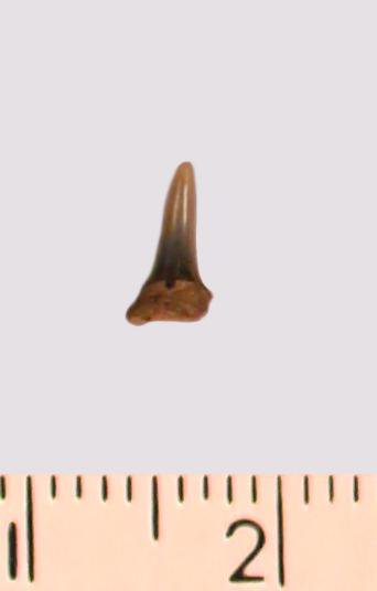 Зуб (фрагмент). Акула. Eostriatolamia gracilis (Davis, 1890). Классификация: Хордовые Chordata, Позвоночные Vertebrata, Хрящевые рыбы Chondrichthyes, Пластиножаберные Elasmobranchii
