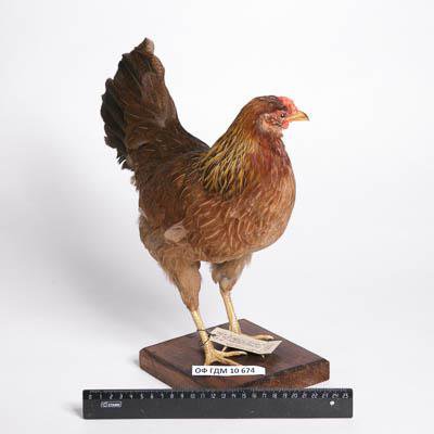 Чучело. Курица породы Вальдзумер (карликовая форма). Классификация: Хордовые Chordata, Позвоночные Vertebrata, Птицы Aves, Курообразные Galliformes, Фазановые Phasianidae