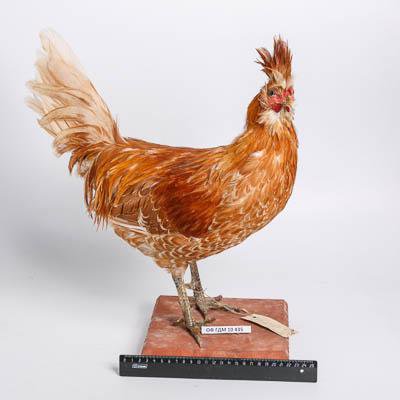 Чучело. Петух породы Падуан "Жабо". Классификация: Хордовые Chordata, Позвоночные Vertebrata, Птицы Aves, Курообразные Galliformes, Фазановые Phasianidae