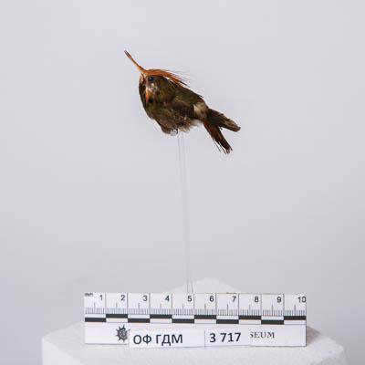 Чучело. Красночубый колибри-кокетка. Lophornis delattrei (Lesson,1839). Классификация: Хордовые Chordata, Позвоночные Vertebrata, Птицы Aves, Стрижеобразные Apodiformes, Колибри Trochilidae, Красночубый колибри-кокетка Lophornis delattrei (Lesson,1839)