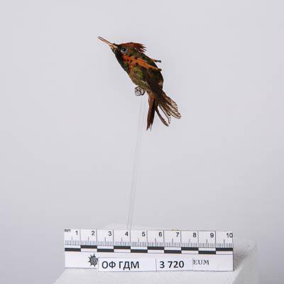 Чучело. Украшенный колибри-кокетка. Lophornis ornata (Boddaert,1783). Классификация: Хордовые Chordata, Позвоночные Vertebrata, Птицы Aves, Стрижеобразные Apodiformes, Колибри Trochilidae, Украшенный колибри-кокетка Lophornis ornatus (Boddaert,1783)