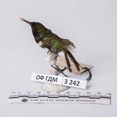 Чучело. Гиацинтовый колибри-капуцин. Augastes scutatus (Temminck,1823). Классификация: Хордовые Chordata, Позвоночные Vertebrata, Птицы Aves, Стрижеобразные Apodiformes, Колибри Trochilidae, Гиацинтовый колибри-капуцин Augastes scutatus (Temminck,1824)