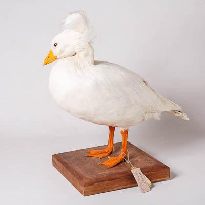 Чучело. Утка домашняя вар.: cristata. Классификация: Хордовые Chordata, Позвоночные Vertebrata, Птицы Aves, Гусеобразные Anseriformes, Утиные Anatidae