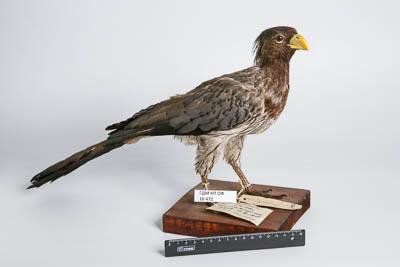 Чучело. Чернохвостый бананоед-подорожник. Crinifer piscator (Boddaert). Классификация: Хордовые Chordata, Позвоночные Vertebrata, Птицы Aves, Кукушкообразные Cuculiformes, Тураковые Musophagidae, Чернохвостый бананоед-подорожник Crinifer piscator (Boddaert,1783)