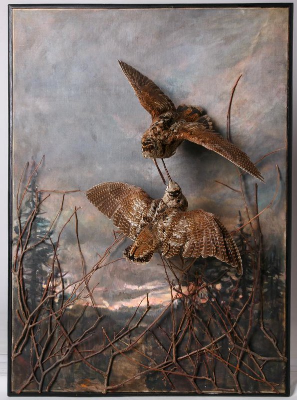 Чучело в биогруппе. Вальдшнеп. Scolopax rusticola L.,1758. Классификация: Хордовые Chordata, Позвоночные Vertebrata, Птицы Aves, Ржанкообразные Charadriiformes, Бекасовые Scolopacidae, Вальдшнеп Scolopax rusticola L.,1758