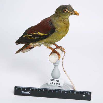 Чучело. Малый зеленый голубь. Treron olax (Temminck)? Классификация: Хордовые Chordata, Позвоночные Vertebrata, Птицы Aves, Голубеобразные Columbiformes, Голубиные Columbidae, Малый зеленый голубь Treron olax (Temminck, 1823)
