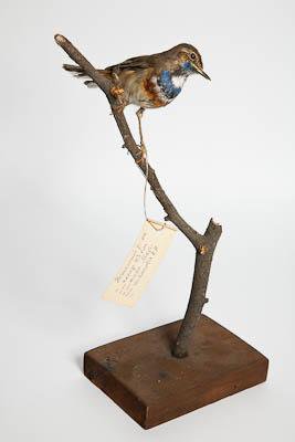 Чучело. Варакушка. Luscinia svecica (L.,1758). Классификация: Хордовые Chordata, Позвоночные Vertebrata, Птицы Aves, Воробьинообразные Passeriformes, Дроздовые Turdidae, Варакушка Luscinia svecica (L.,1758)