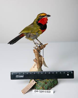 Чучело. Коричневолобый кутарниковый сорокопут. Telophorus viridis (Vieillot). Классификация: Хордовые Chordata, Позвоночные Vertebrata, Птицы Aves, Воробьинообразные Passeriformes, Кустарниковые сорокопуты Malaconotidae, Коричневолобый кустарниковый сорокопут Telophorus viridis (Vieillot,1817)