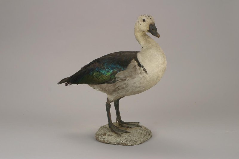 Чучело. Шишконосый гусь. Sarkidiornis melanotos (Penn.,1769). Классификация: Хордовые Chordata, Позвоночные Vertebrata, Птицы Aves, Гусеобразные Anseriformes, Утиные Anatidae, Гребенчатая утка Sarkidiornis melanotos (Pennant,1769)