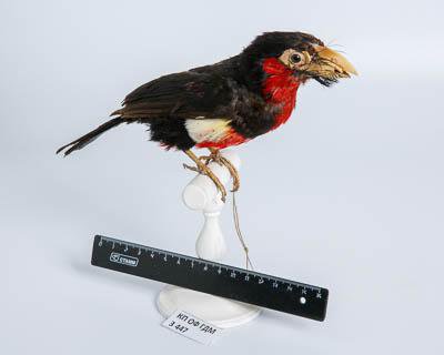 Чучело. Сенегальский бородастик-либия. Lybius dubius Gm.,1788. Классификация: Хордовые Chordata, Позвоночные Vertebrata, Птицы Aves, Дятлообразные Piciformes, Бородатковые Capitonidae, Сенегальский бородастик Pogonornis dubius (Gmelin,1788)