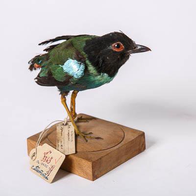 Чучело. Черноголовая питта. Pitta sordida (Muller,1776)? Классификация: Хордовые Chordata, Позвоночные Vertebrata, Птицы Aves, Воробьинообразные Passeriformes, Питтовые Pittidae, Черноголовая питта Pitta sordida (P.L.S.Muller,1776)