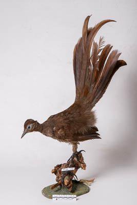 Чучело. Большая птица-лира. Menura novaehollandiae (Latham,1801). Классификация: Хордовые Chordata, Позвоночные Vertebrata, Птицы Aves, Воробьинообразные Passeriformes, Лирохвостые Menuridae, Большая птица-лира Menura novaehollandiae (Latham,1801)